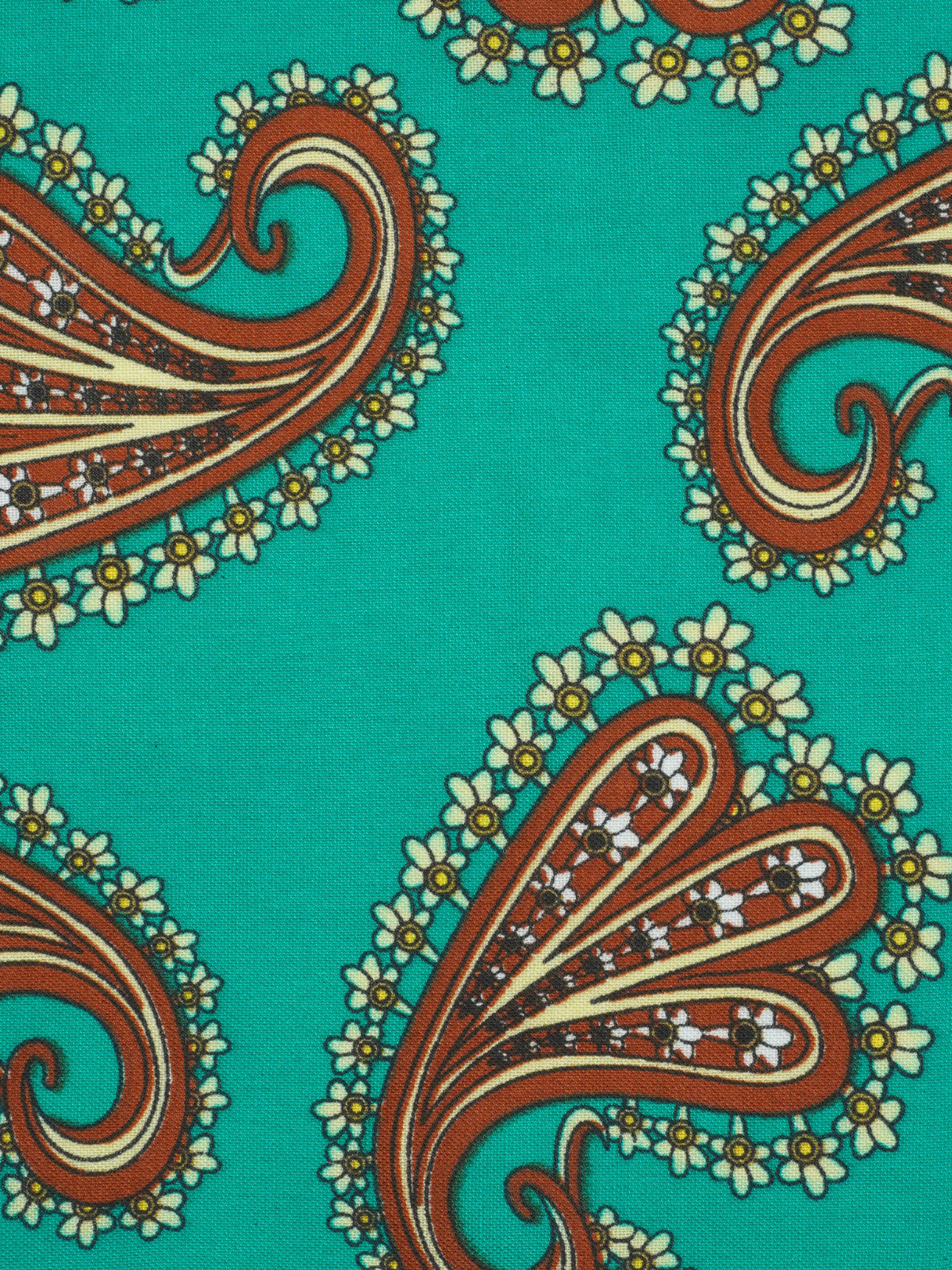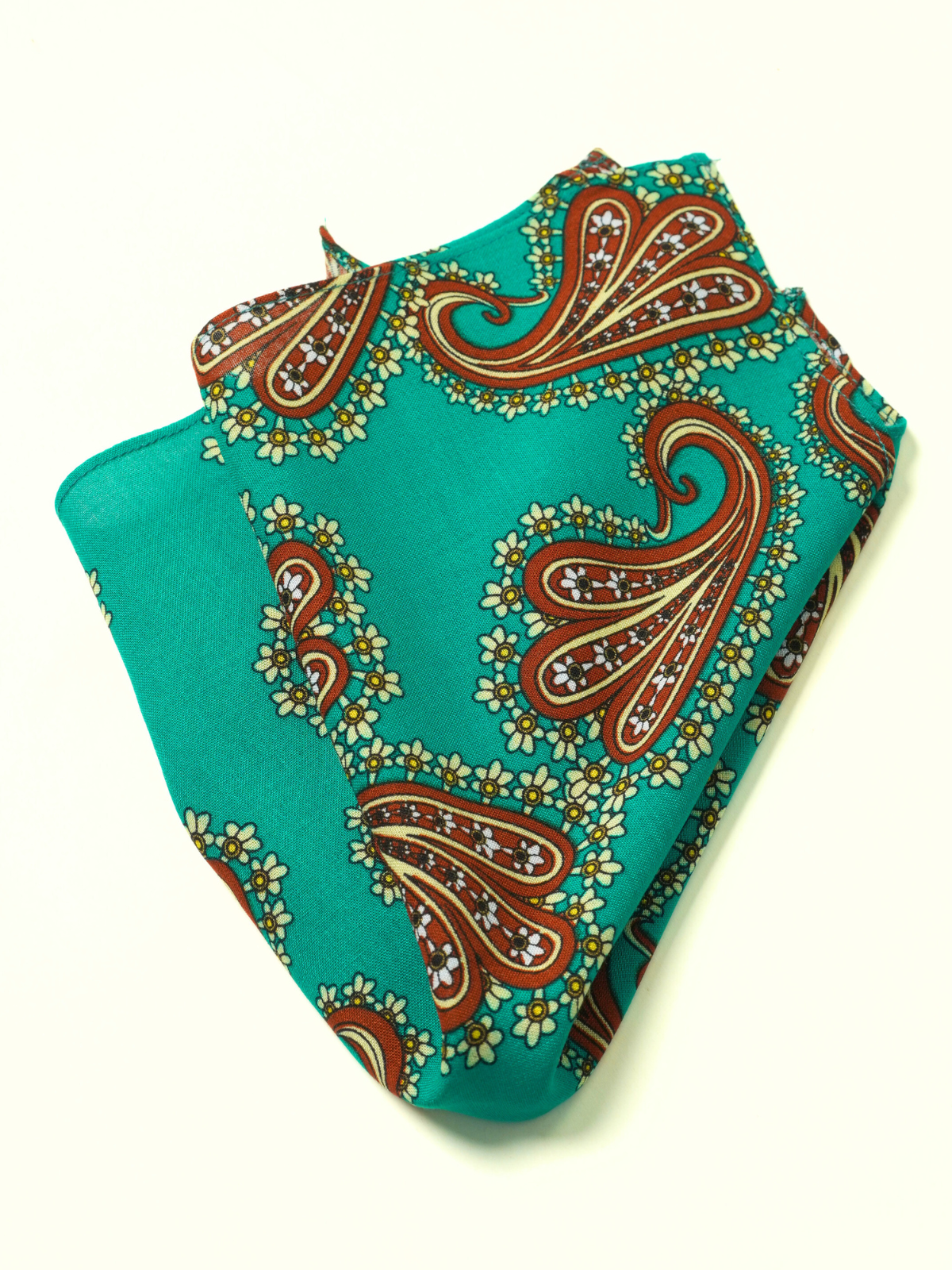 The fabric of the pocket square is Cotton. The size is 12” by 12”.