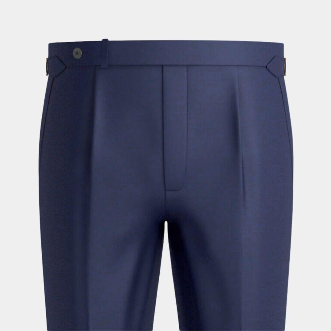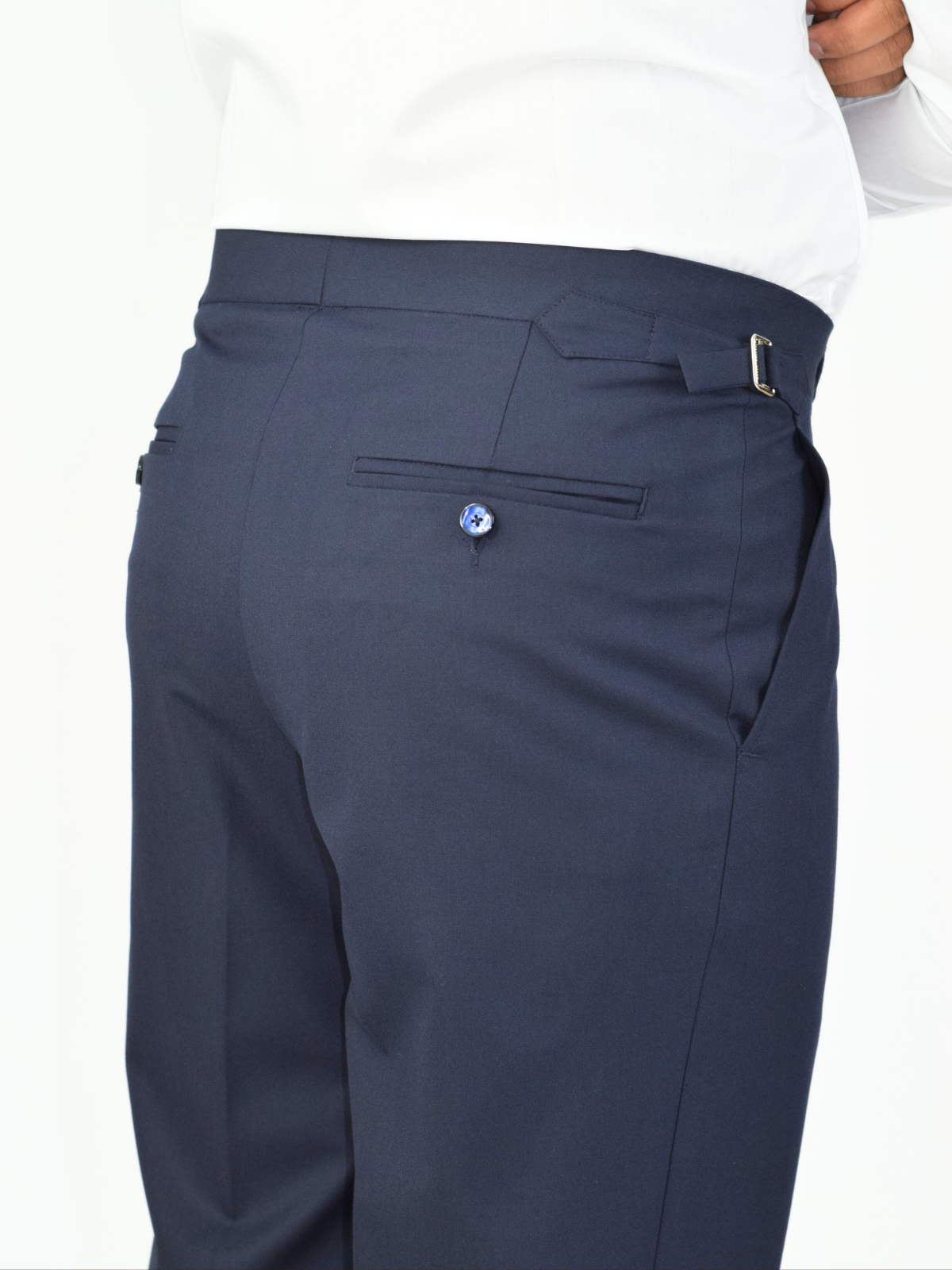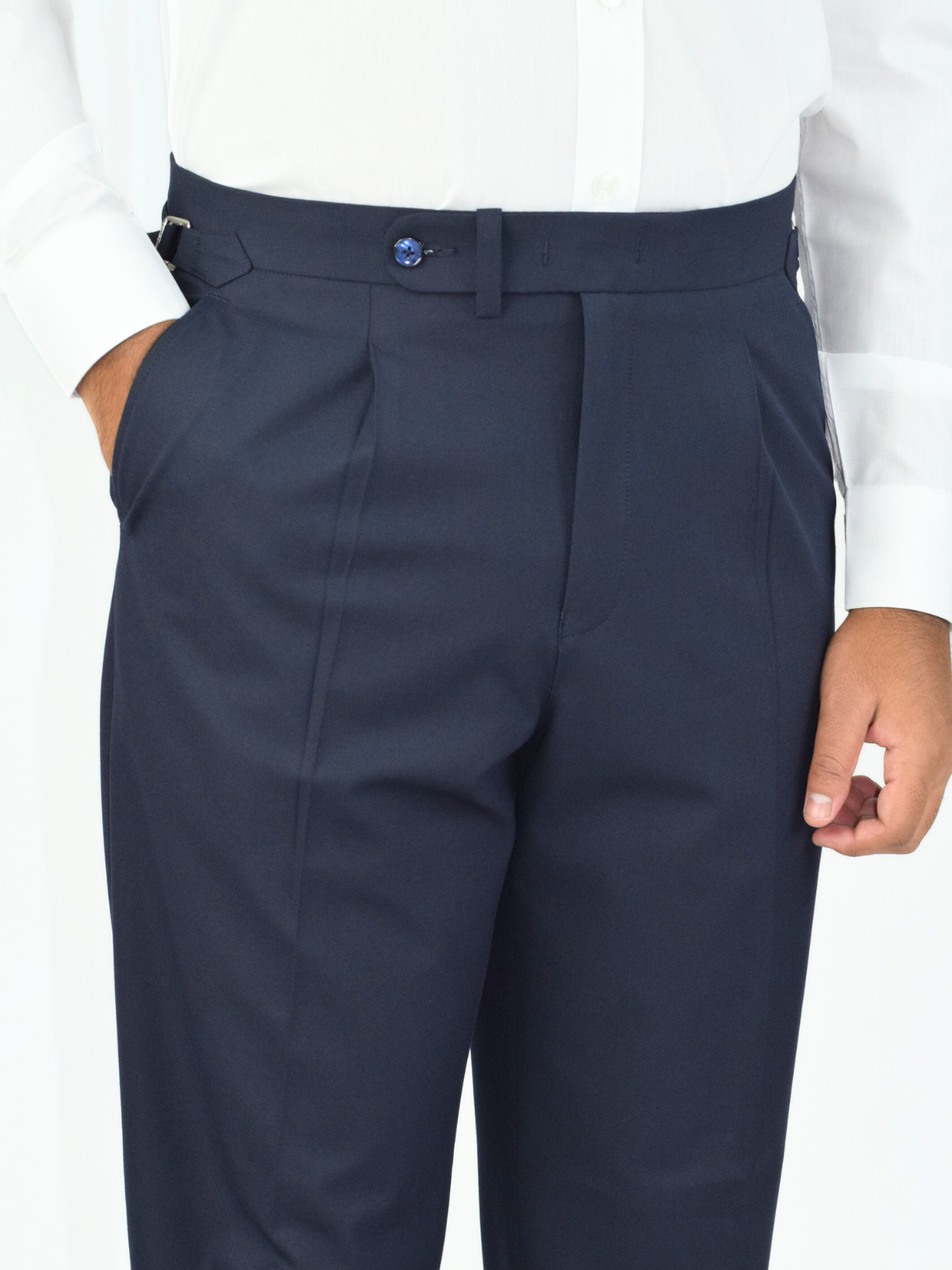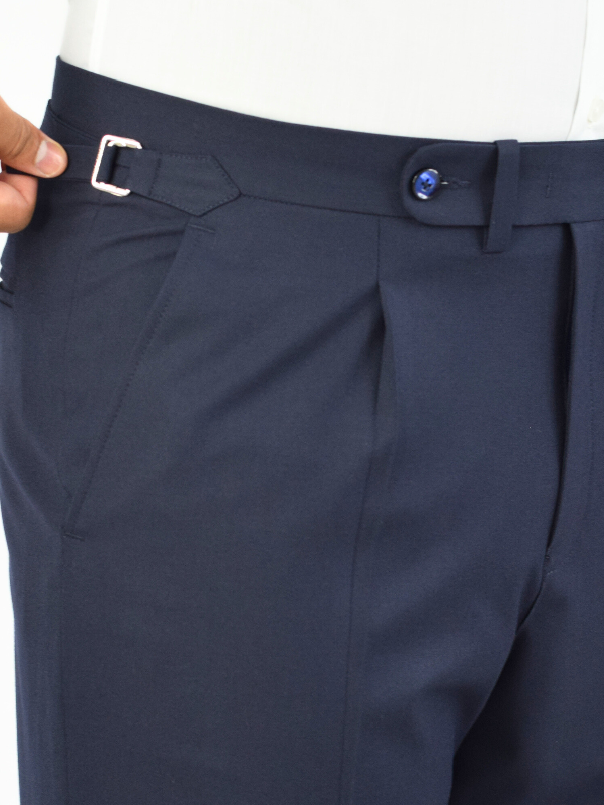 The fabric of the trousers is "Indian tropical cotton blend". The fit is tapered & high-waisted.