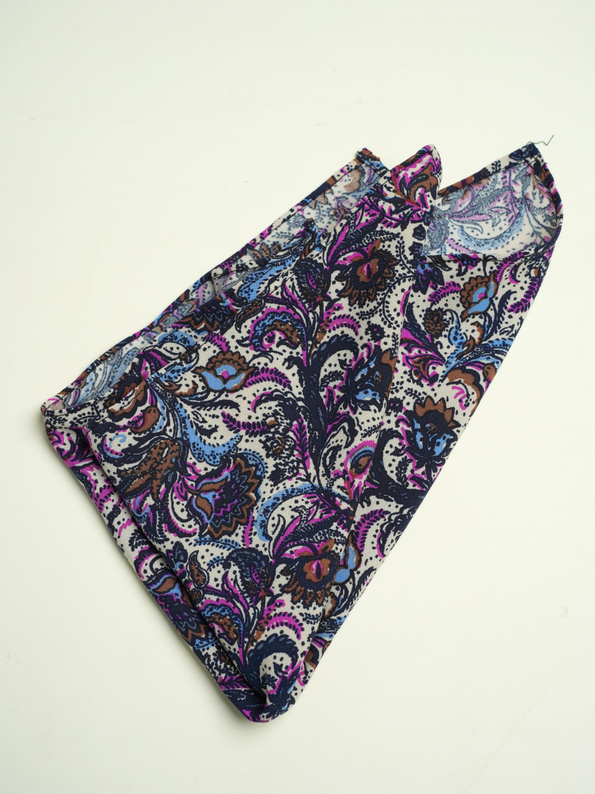 The fabric of the pocket square is Cotton. The size is 14” by 14”.