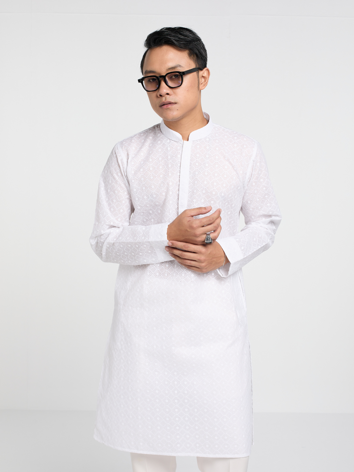 Designed with a structured Mandarin collar and a concealed placket, the silhouette remains sharp, balanced, and timeless. Ideal for festive gatherings, evening occasions, or refined daywear.