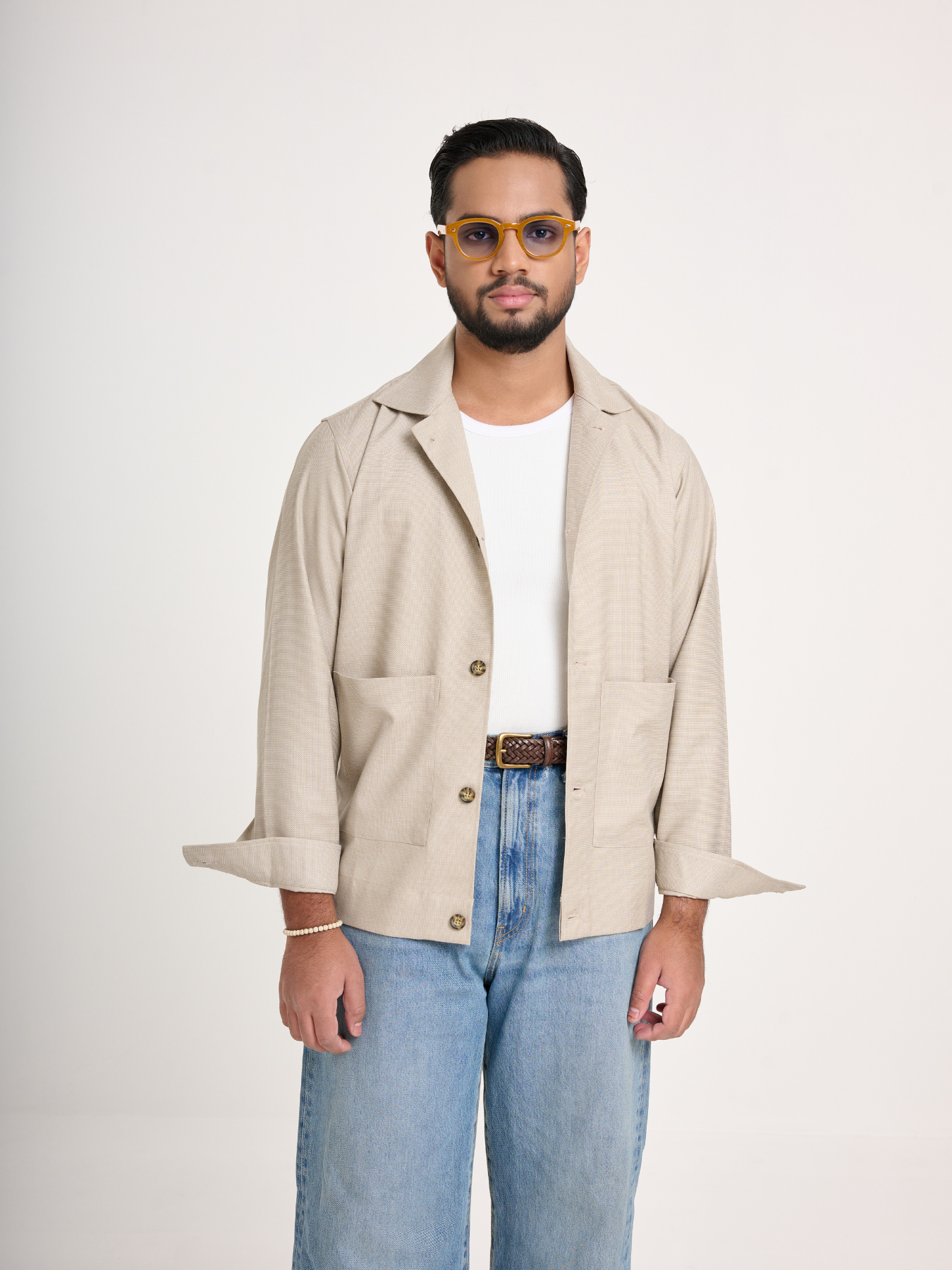 Refined yet effortlessly casual, this lightweight shacket is designed to be your go-to layering piece for everyday wear. Crafted from a breathable cotton-blend fabric with a subtle micro-check texture, it brings a touch of sophistication to laid-back styling.