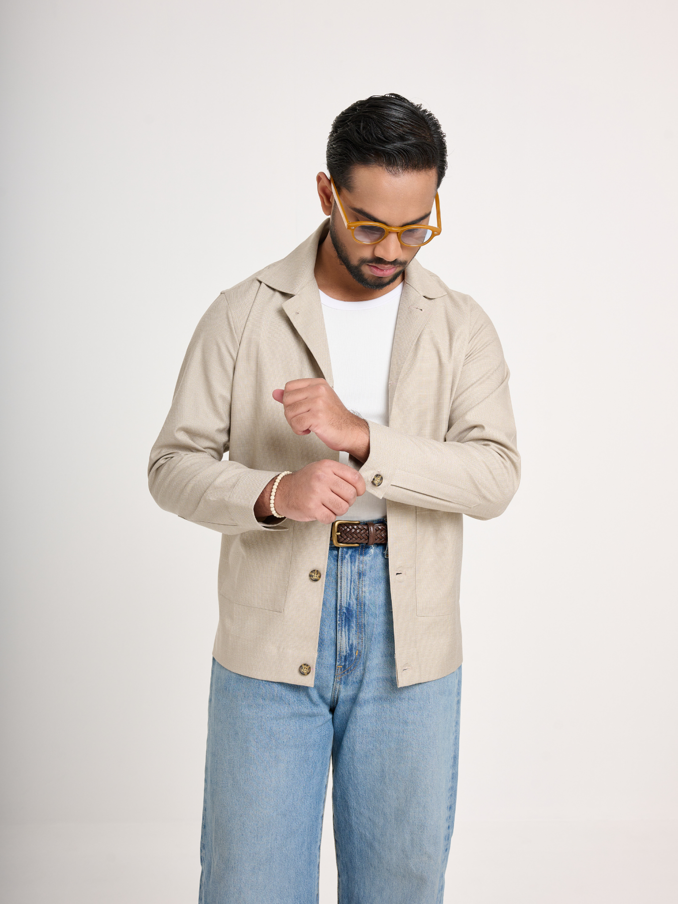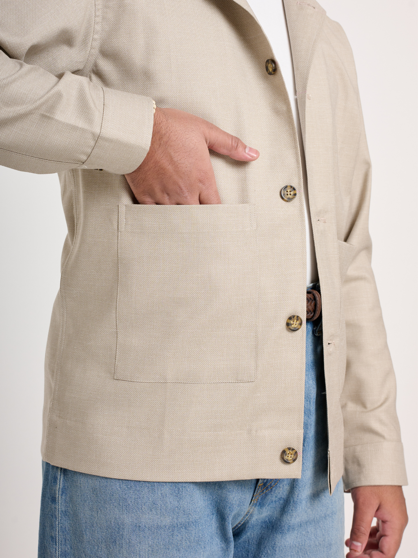 The open-collar design and relaxed straight fit lend an easy drape, while the large front patch pockets add both practicality and character. Finished with tonal buttons, this piece transitions seamlessly between weekday errands and weekend brunches.
